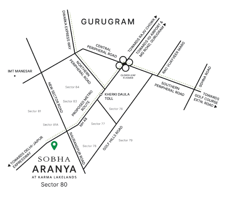 The project features five towers with 3B + G + 43/46 floors. The entire project will be developed and delivered in phases. 5 towers of phase 1 will have 524 residences in total. Some of the renowned schools, hospitals, commercial and entertainment hubs are in close proximity of this project. Sobha Aranya Sector 80 Gurgaon is a unique blend of modern infrastructure and eco-friendly environment. None of the apartments will face each other to allow residents complete privacy. Every house is made to make you feel calm and in balance.